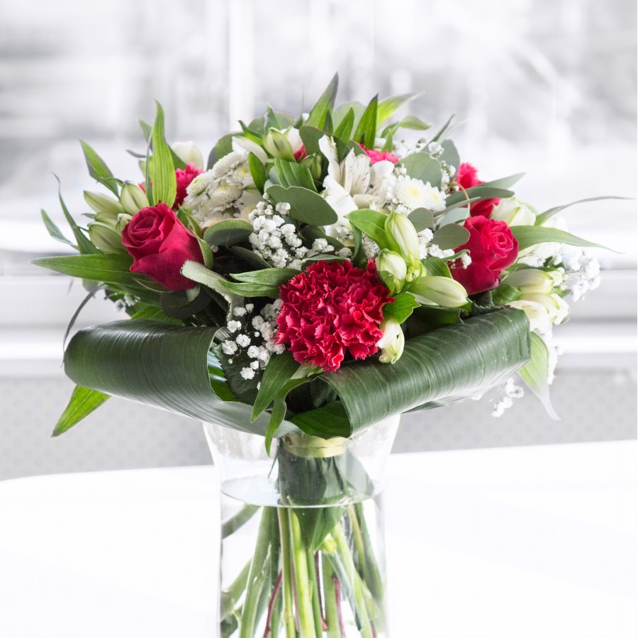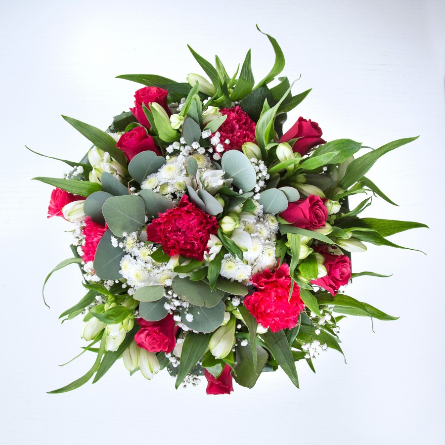 Celebrate timeless beauty with our exquisite bouquet, featuring white chrysanthemums and gypsophila, paired with luxurious red roses and delightful carnations. Accented with white alstroemeria and elegant aspidistra leaves, this arrangement is a unique masterpiece of color and design.