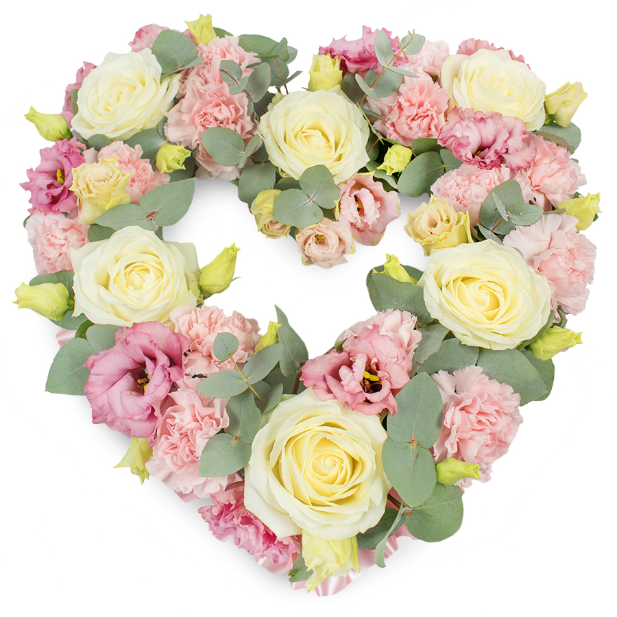 A full, heart-shaped funeral wreath is shown against a bright white background, the delicate arrangement of pastel flowers conveying a gentle, comforting mood. The heart is completely filled with tightly packed blooms, dominated by creamy yellow and ivory roses whose layered petals create rounded, elegant focal points across the design. Interwoven among these roses are generous clusters of light pink carnations, their frilled petals giving a soft, almost feathery texture that blurs the boundaries between each flower and adds to the wreath's sense of tenderness. Richer notes come from magenta and mauve-pink lisianthus blossoms, their slightly fluted, open forms adding variety in shape and depth of colour, reminiscent of the soft evening light over Harold Wood's residential streets. Cool, silvery-green eucalyptus leaves curl and loop throughout, their rounded forms and muted tone creating a calm backdrop that outlines the heart's curves and brings visual balance. Small yellowish-green buds appear between the larger blooms, catching the eye and hinting at the freshness of flowers prepared the same day at a local Harold Wood florist. The dense, carefully layered placement of every stem results in a wreath that feels complete and supportive, with no empty spaces-only overlapping petals and foliage that seem to hold one another up. This heart speaks of enduring love, quiet sorrow, and cherished memories, ideal for resting beside a casket, on a stand at a memorial service, or on a graveside in and around Harold Wood, offering a dignified and compassionate floral tribute when families need it most.
